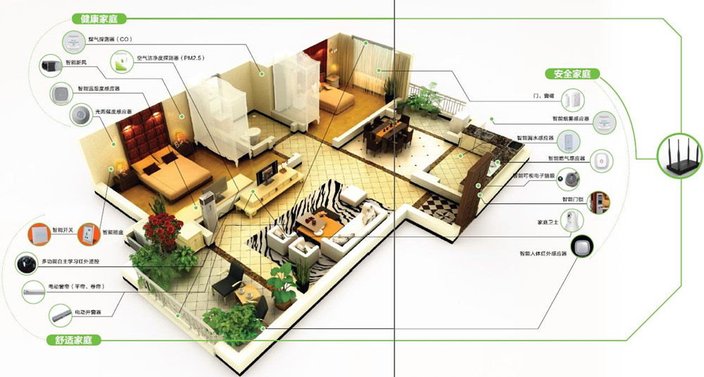 ●智能環(huán)境控制系統(tǒng),時刻調(diào)節(jié)家庭溫濕度、監(jiān)控室外PM2.5、室內(nèi)光照度,確保您有一個舒適的居家環(huán)境;