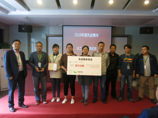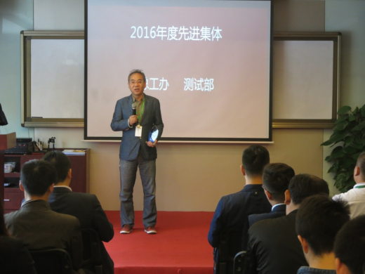 The third agenda was to award the 2016 annual advanced collectives. Chief engineer office test department successfully completed the test tasks assigned by the company. In particular, in the case of insufficient team personnel and many technical bottlenecks, the team accomplished the GPRS test project with unremitting exploration and research, stood out in the evaluation contest with various departments and won the advanced collectives award for the year 2016. Ji Rongxin, chairman of the company, awarded the honorary certificate and trophy to the test department.